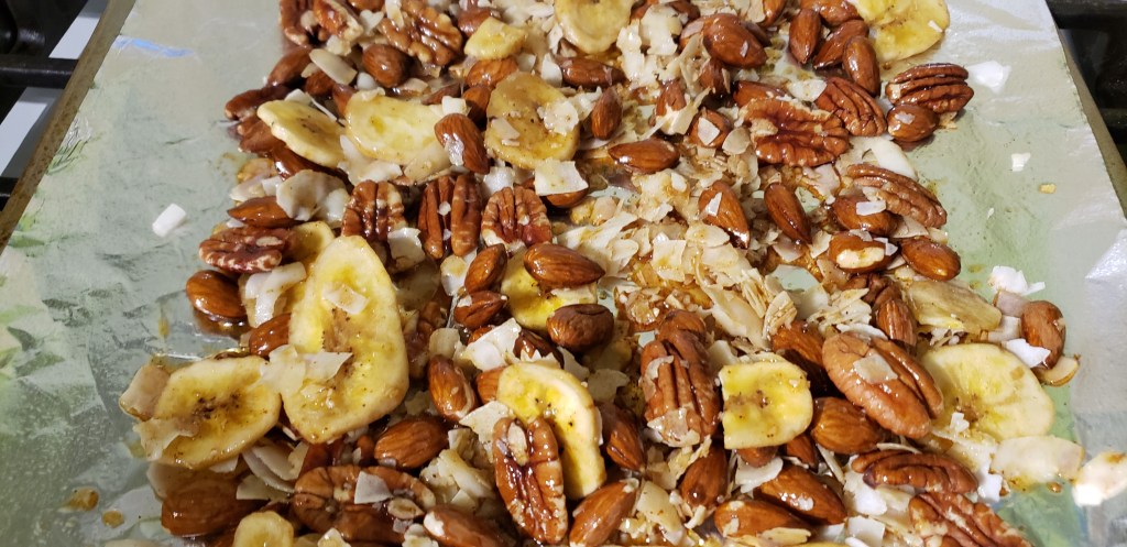 - Combine banana chips, coconut flakes almonds, and pecans in a bowl until well mixed, then spread on the sheet
