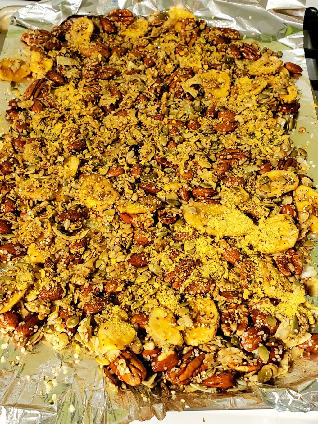 - Pour the warm liquid and spices over the mixture on the cookie sheet and mix well. Then sprinkle on the remaining nuts and seeds: