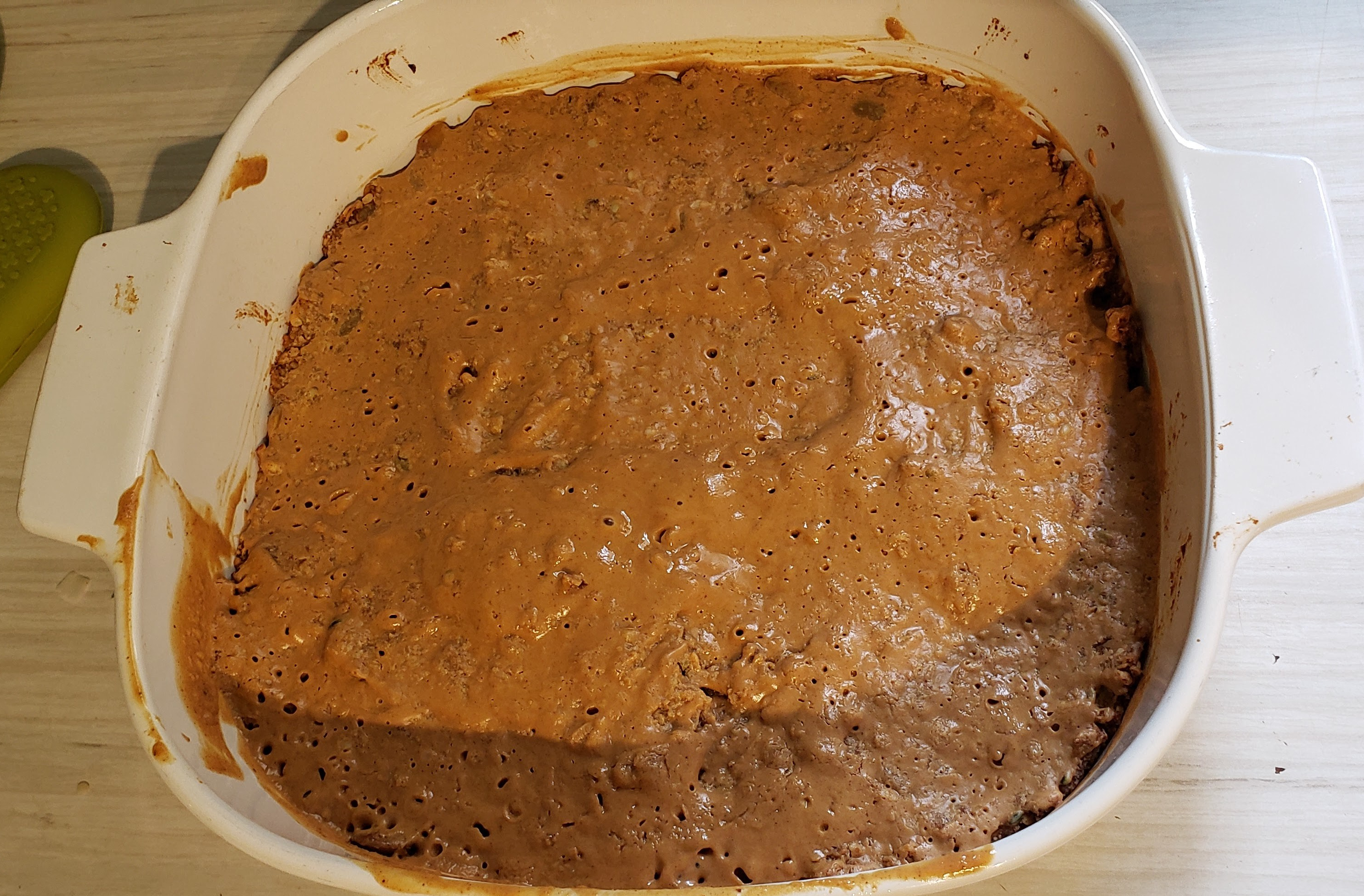 - Remove from oven and spread 1/4 cup peanut butter across the top with a flexible spatula (careful not to scrape up the mixture)