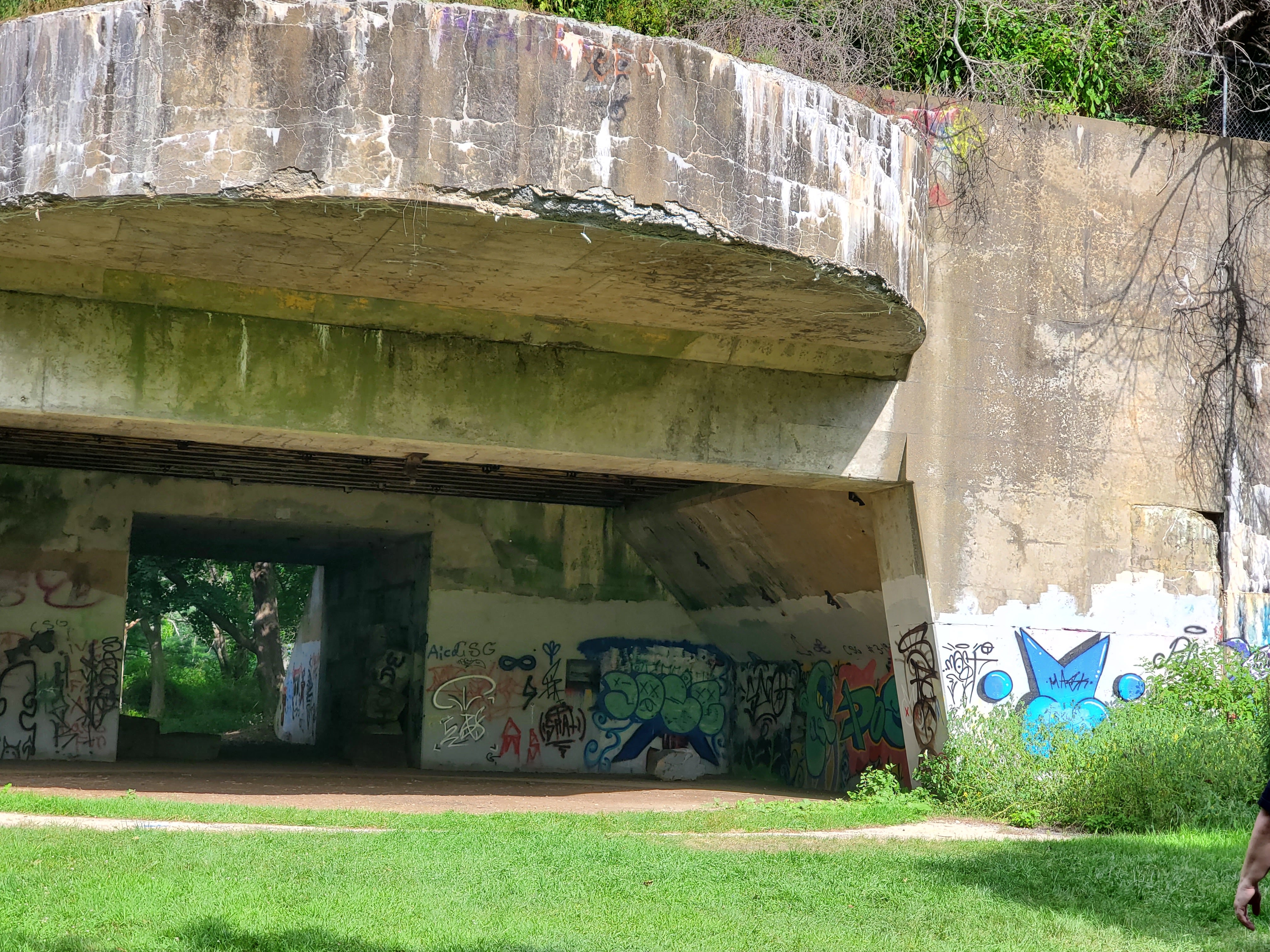 The point looks out over open ocean all the way to Isles of Shoals and we could see a lighthouse. We knew it was our next stop, Fort Stark. We continued around the point, partly on the paved bike trails, and walked past more abandoned buildings that reminded me of the cinder block booths that used to greet us at the local drive-in (now I’m dating AND regionalizing myself!). Memories of dancing popcorn boxes and Father Time counting down the minutes to “showtime” danced in my head. At one point we walked along the trail beside what MIGHT have been an old bunker. There were periodic cement underpasses with doors that look like they’ve been locked for a very long time. All these years later, these bunker-esque style buildings featured amazing graffiti, and in some cases, large granite blocks had been installed to block the doors.