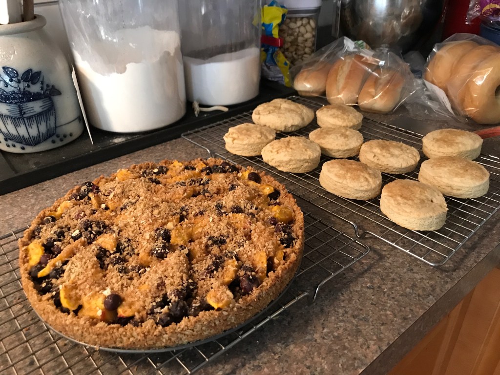 Update 8/12/2020 – After posting this story and recipe, my sister texted and said she wanted to make it. So she used my recipe and made a few further tweaks. Plus added some additional vegan options. I’ve used two of her photos, and am happy to hear that she also thinks this is “Very, very good!” She was inspired to try something new AND make a recipe that required a bit of freedom (my instructions don’t specify the number of peaches, and I tend to say “a pinch of this, a handful of that.”