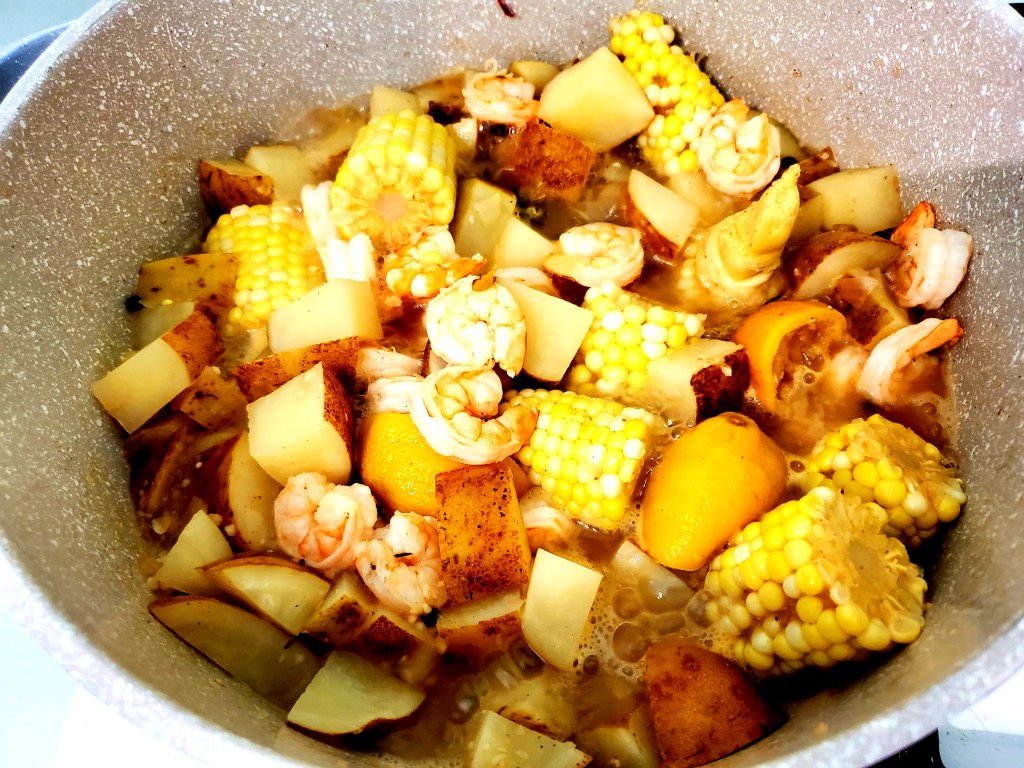 - Transfer shrimp and potatoes to a large bowl. Mix the butter, the artichokes, and a cup or so of broth together and pour over the shrimp and potatoes. Mix well.