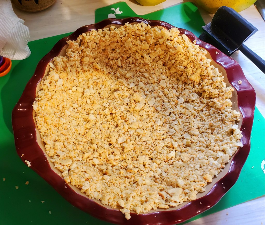- Crush crackers finely either by hand (I used a potato masher) or by food processor but don’t grind to a powder