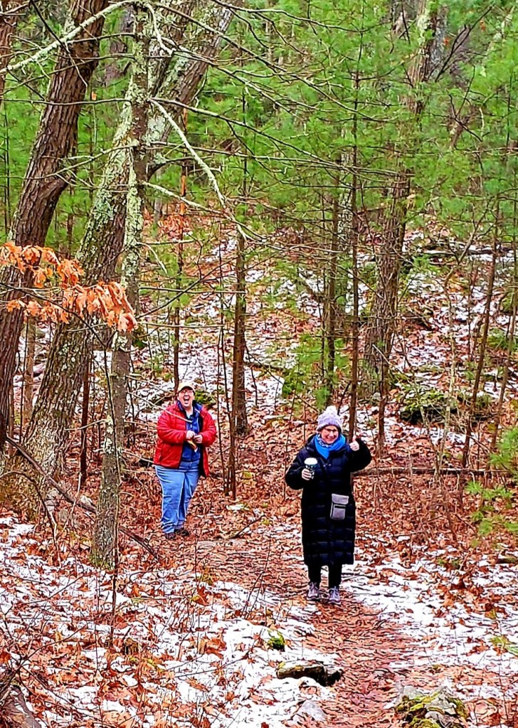 Since we’ve also agreed we’ll walk through winter, and Massachusetts has established guidelines about wearing masks in all public spaces, we wear them hiking. It’s been interesting experimenting with appropriate winter wear for hiking. Sandy brought her coffee along, and in this photo, you can see Beth laughing as I comment on “the new yorker” carrying her coffee and dressed in her fancy coat as she “hikes” through the woods.