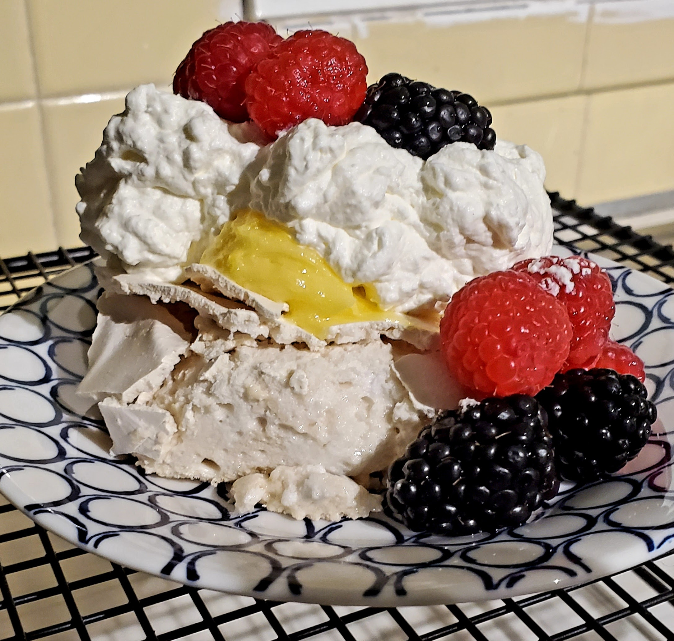 - Once cool, fill the pavlova with a layer of lemon curd, a layer of mixed berries, a few tablespoons of whipped cream, the rest of the berries, and then more whipped cream, with a few teaspoons of lemon or orange zest and maybe a garnish of a mint leaf or two.