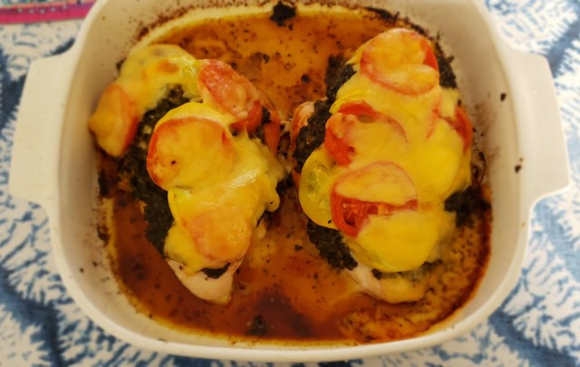 This easy baked chicken recipe uses pesto, squash, mushrooms, and smoked gouda. Everything in one dish and ready in under an hour!